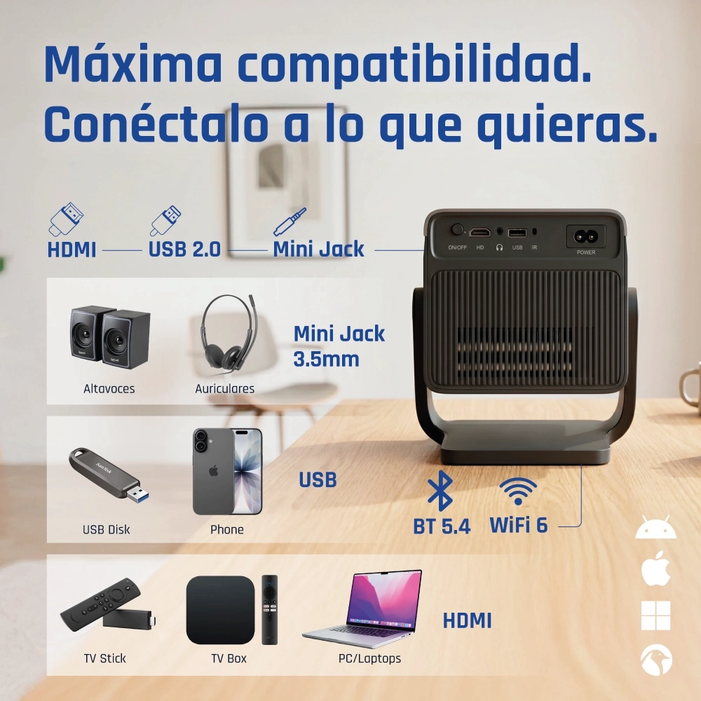 - Compatible con: Miracast, AirPlay, DLNA, Android (por cable), Apple (por cable)